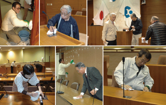 5年前からの恒例行事、議場の大掃除を行いました。1年間の感謝の気持ちを込め、議員みずから机拭きやフロアの掃除機がけ、窓拭きをしました。