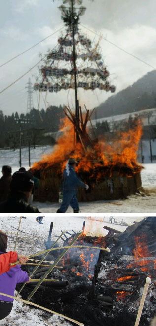 上志比どんど焼きが行われ、議員5名も出席しました。わらや枝などで作られたやぐらで、正月飾りや書き初め等を燃やし、燃やした火で餅を焼いて食べ、健康を祈願しました。
