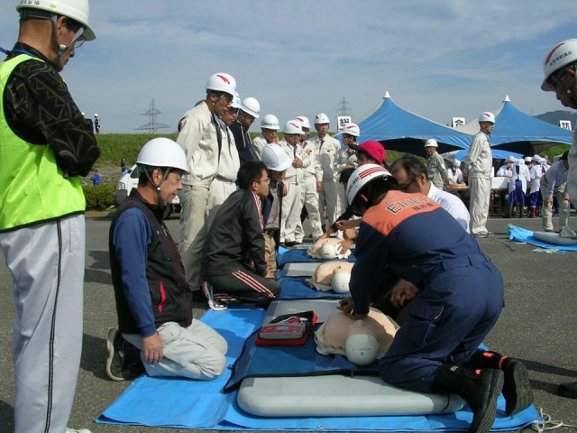 永平寺町防災訓練が松岡河川公園で行われ、議員も参加しました。応急処置、AED蘇生訓練では実習を受けました。若手議員の一人は消防団員として参加し、きびきびと訓練しました。