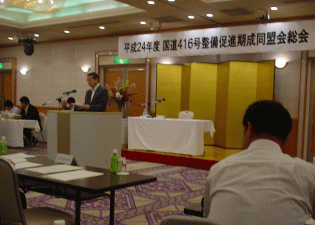 国道416号整備促進期成同盟会に、伊藤博夫議長と川治孝行産業建設常任委員会委員長が出席。同盟会では平成24年度事業計画及び歳入歳出予算などの議案6件と、決議「①国道416号の整備促進」「②道路整備を強力に推進するため、必要な財源を安定的に確保すること」について決しました。