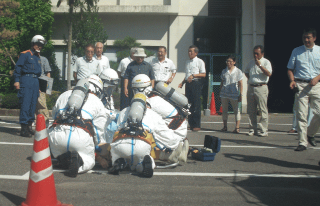 テロ災害等を想定し、特殊災害対応訓練と科学防護服についての説明を受けました。訓練に参加した隊員は、各人真剣な面持ちで実行動を想定しながら迅速に行動し、救急救助活動を行っていました。